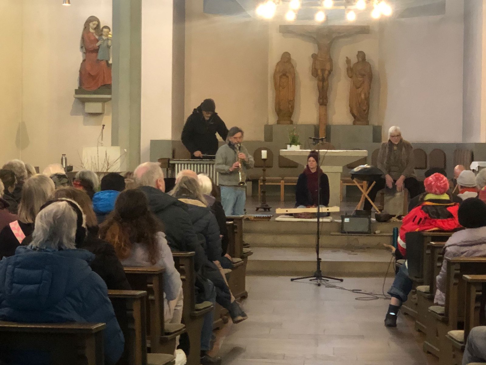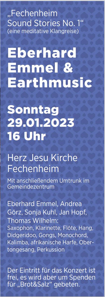 Der Fechenheimer Musiker Eberhard Emmel und die Herz Jesu Gemeinde Fechenheim luden am Sonntag, dem 29. Januar 2023 zu einem besonderen musikalischen Ereignis ein. Der Jazzmusiker führte im Ensemble Eberhard Emmel & Earthmusic außereuropäische Musikkulturen und Musiker mit außergewöhnlichen Instrumenten wie Didgeridoo, Gongs, Monochord oder Kalimba zusammen.